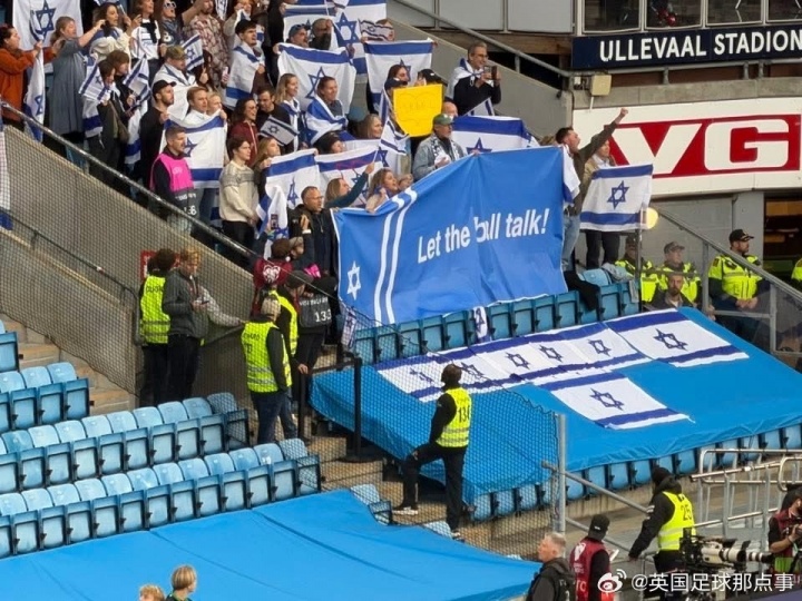 挪威5比0以色列比赛中两队球迷打出的横幅