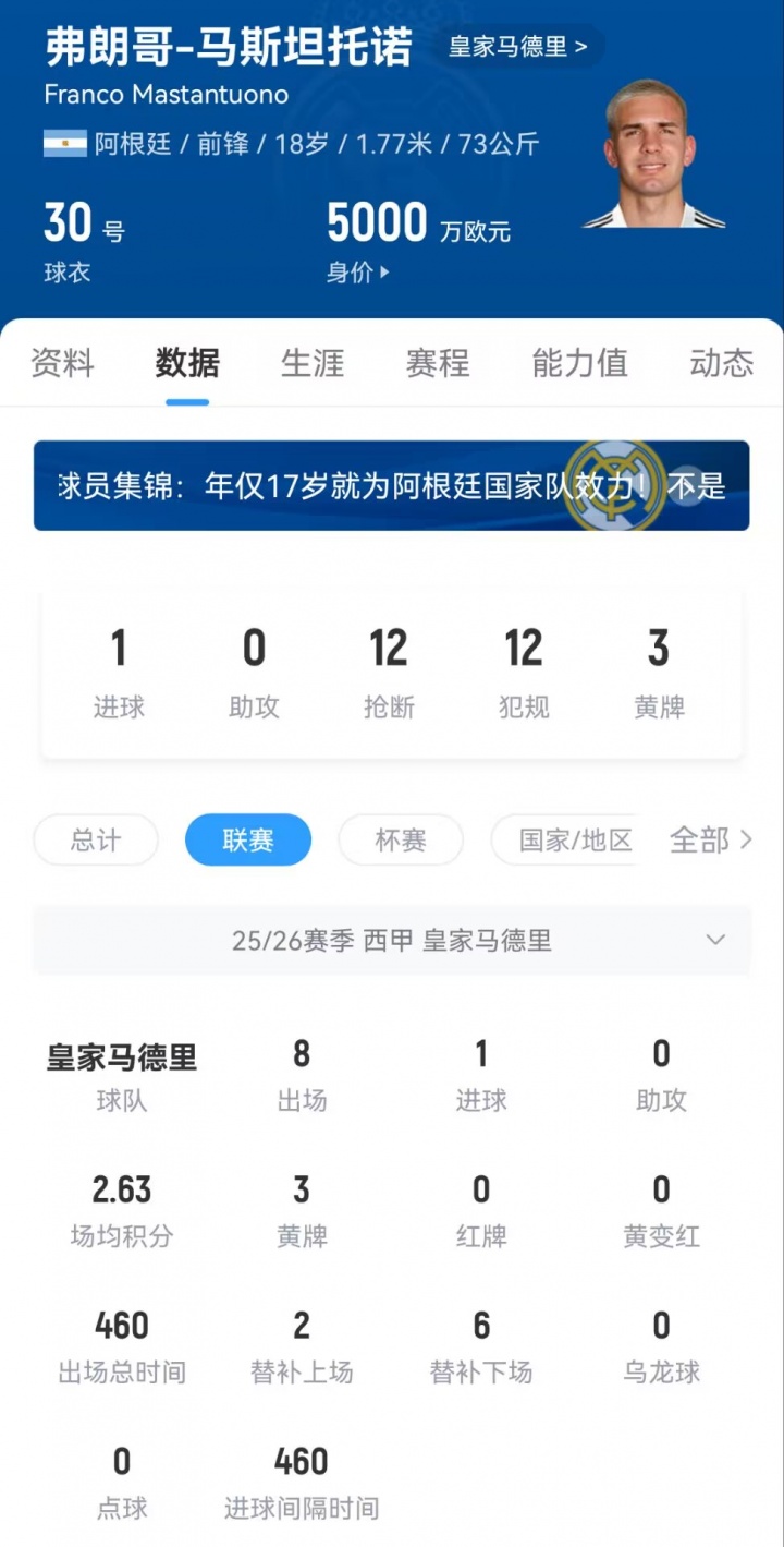 今夏皇马以4500万欧元签下18岁的马斯坦托诺,他于今还是为皇马在联赛出场8次,孝顺1个进球,刻下的身价为5000万欧元。