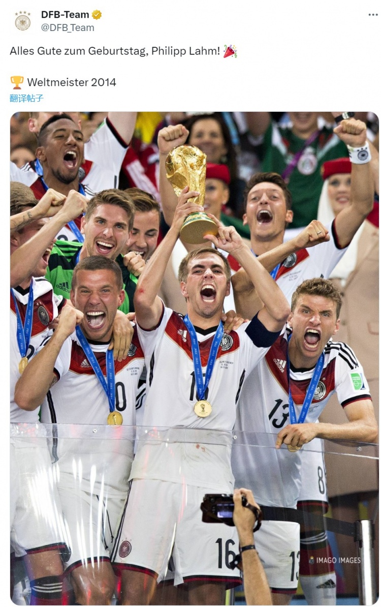 德国队社媒晒出拉姆捧起粗心神杯的像片,配文:“祝2014年寰球杯冠军拉姆诞辰精辟!”