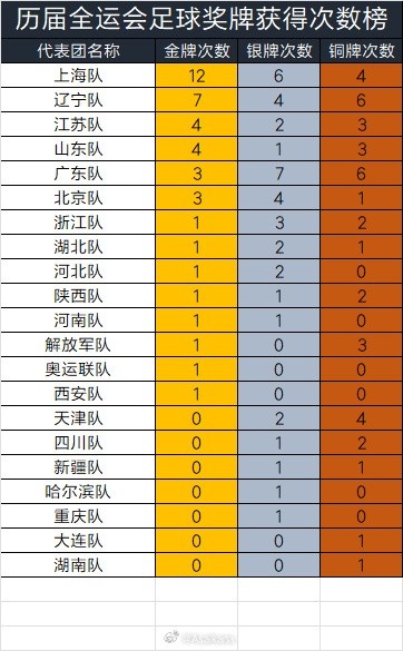 新统计了往届全运会11东谈主制足球技俩奖牌赢得情况和往届全运会足球奖牌赢得次数榜,见表。