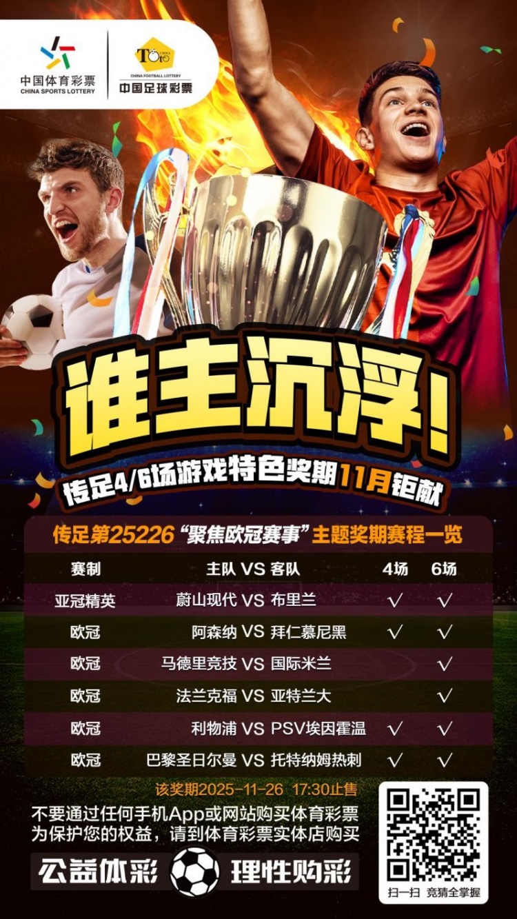 第25226期传足4/6场游戏特色奖期依然于2025年11月23日20:00开售,将于2025年11月26日19:45停售,并于11月27日开奖,其中蔚山当代VS布里兰、阿森纳VS拜仁慕尼黑、利物浦VS PSV埃因霍和缓巴黎圣日尔曼VS托特纳姆热刺为4场进球游戏竞猜赛事。