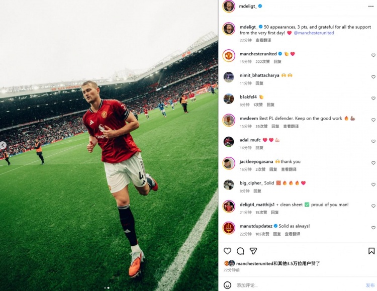 本场比赛德里赫特首发出场迎来曼联糊口50场里程碑,赛后他也在社媒晒照写说念:“50次出场,拿下三分,感谢从始至终齐维持咱们的球迷们!”