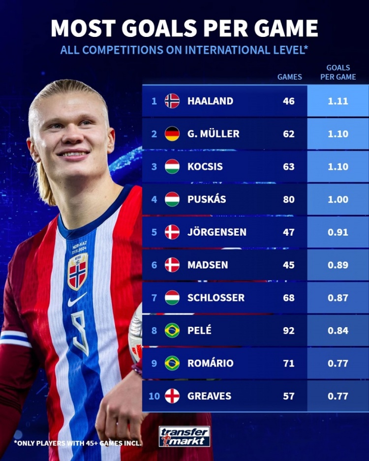 国度队场均进球榜:哈兰德1.11球居首,盖德-穆勒、柯奇士次席