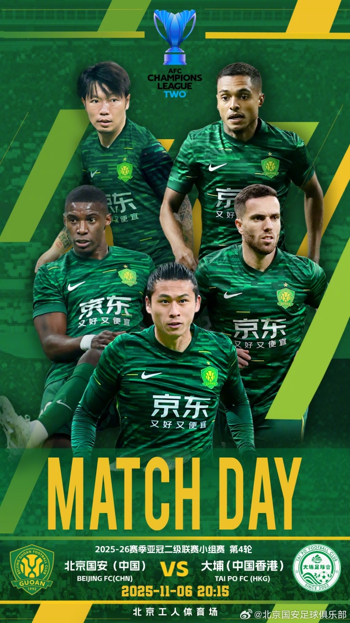 11月06日讯 北京时间今晚20点15分,亚冠二级小组赛E组第4轮,北京国安主场迎战中国香港球队大埔,赛前两边公布首发威望。