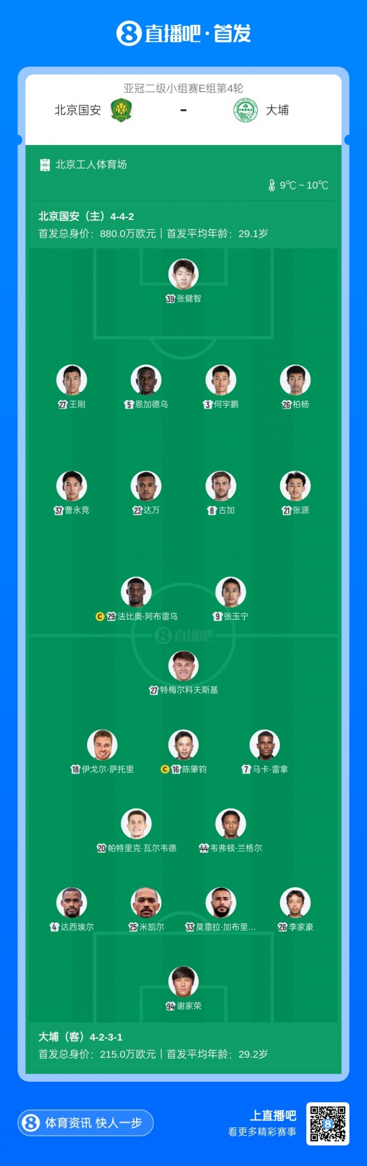 亚冠二-国安vs大埔首发:张健智、张玉宁先发,王刚、法比奥出战