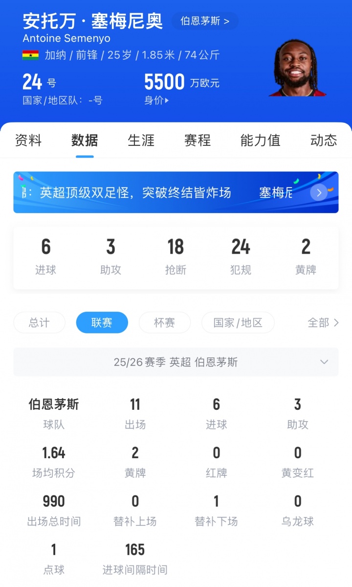 塞梅尼奥现年25岁,司职前卫,他本赛季为伯恩茅斯出战11场英超,孝顺6球3助,他与伯恩茅斯的条约将在2030年到期,现身价5500万欧。
