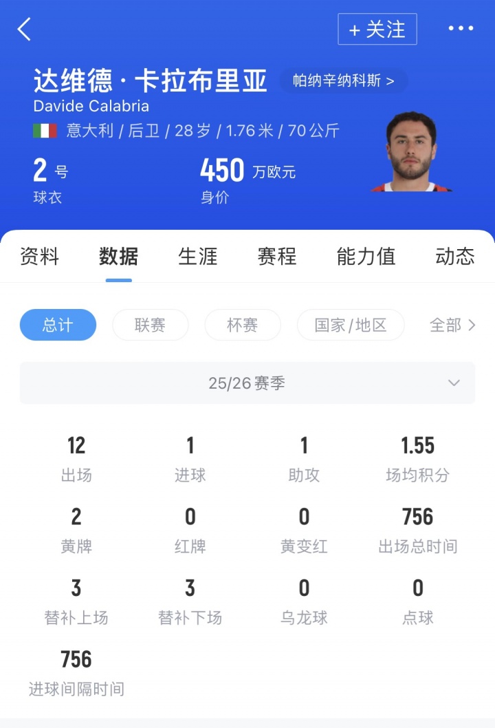 卡拉布里亚现年28岁,这位米兰前队长今夏目田身加盟帕纳辛纳科斯,现在已是球队的主力首发。