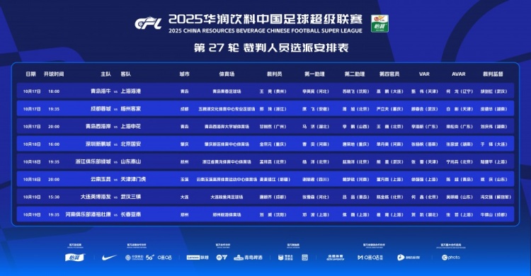 10月18日讯 据博主“裁判圈”报说念,中超第27轮云南玉昆vs天津津门虎,将初次出现三名女裁判同场司法。