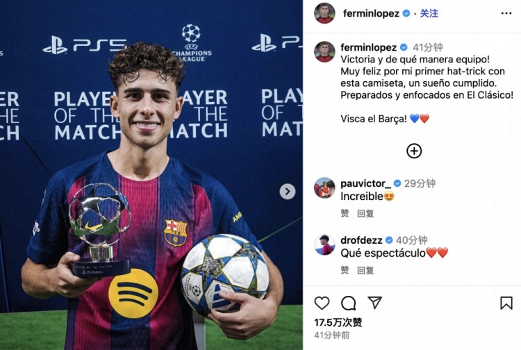 一场顺利,球队踢球的神志太棒了!我十分振奋献艺了身披这件球衣的首个帽子戏法,梦思成真,当今要准备国度德比了!加油巴萨!