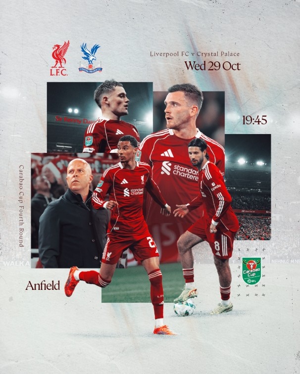 10月29日讯 北京期间10月30日3:45,联赛杯第4轮,利物浦主场对阵水晶宫,利物浦官方发布海报预热。