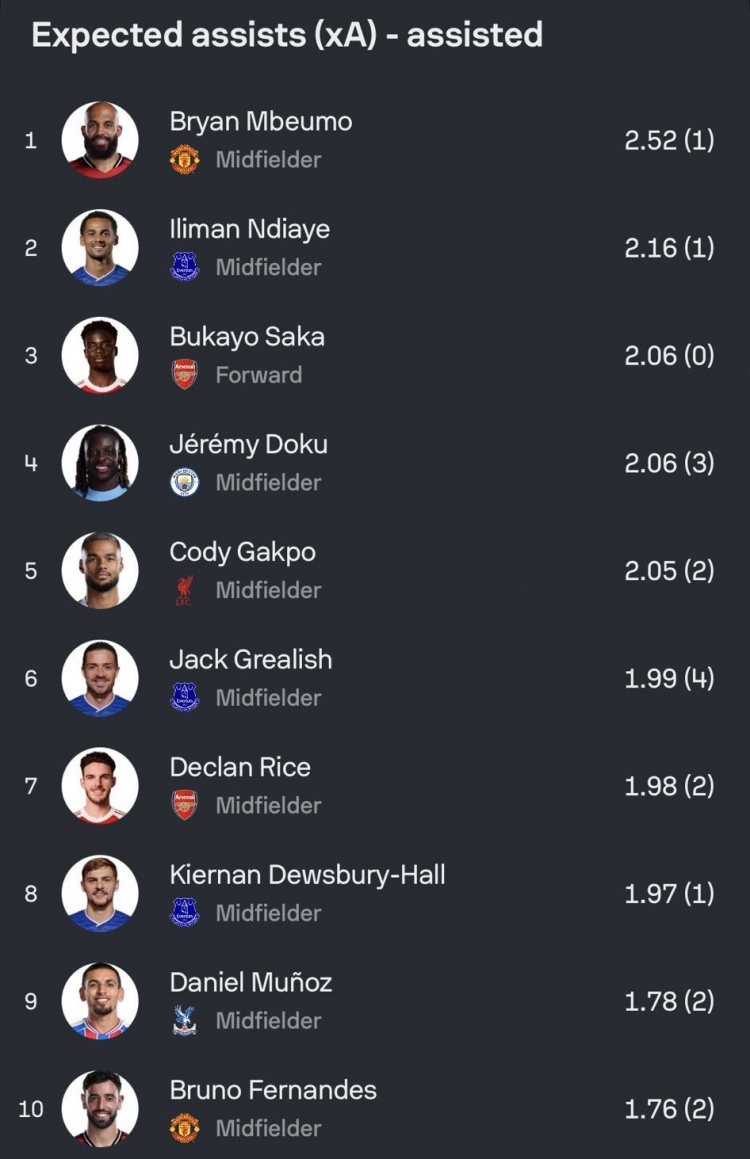 11月4日讯 媒体统计了本赛季球员在英超的预期助攻数据,比肩出榜单,姆伯莫预期助攻2.52次居首,恩迪亚耶、萨卡二三位。