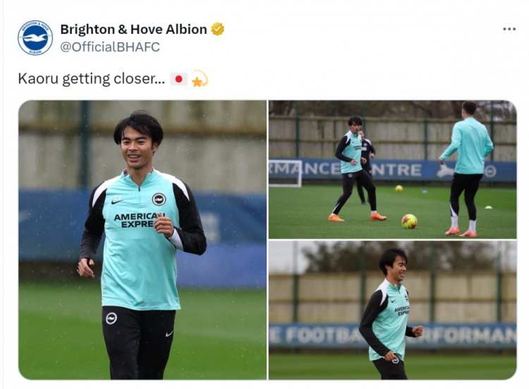 布莱顿社媒晒出三笘薫的像片,阐发这位日本挫折手收复本质,配文:“三笘薫距离复出更近了。”