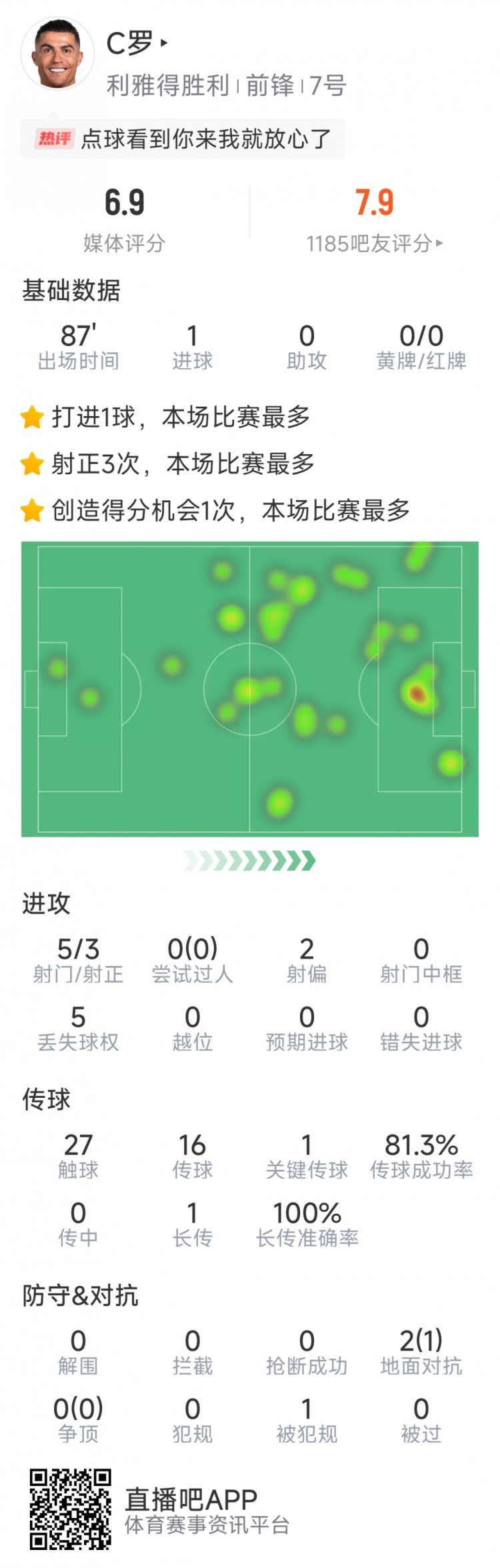 C罗本场数据:点射破门迎告成生存百球,5射3正,1关节传球