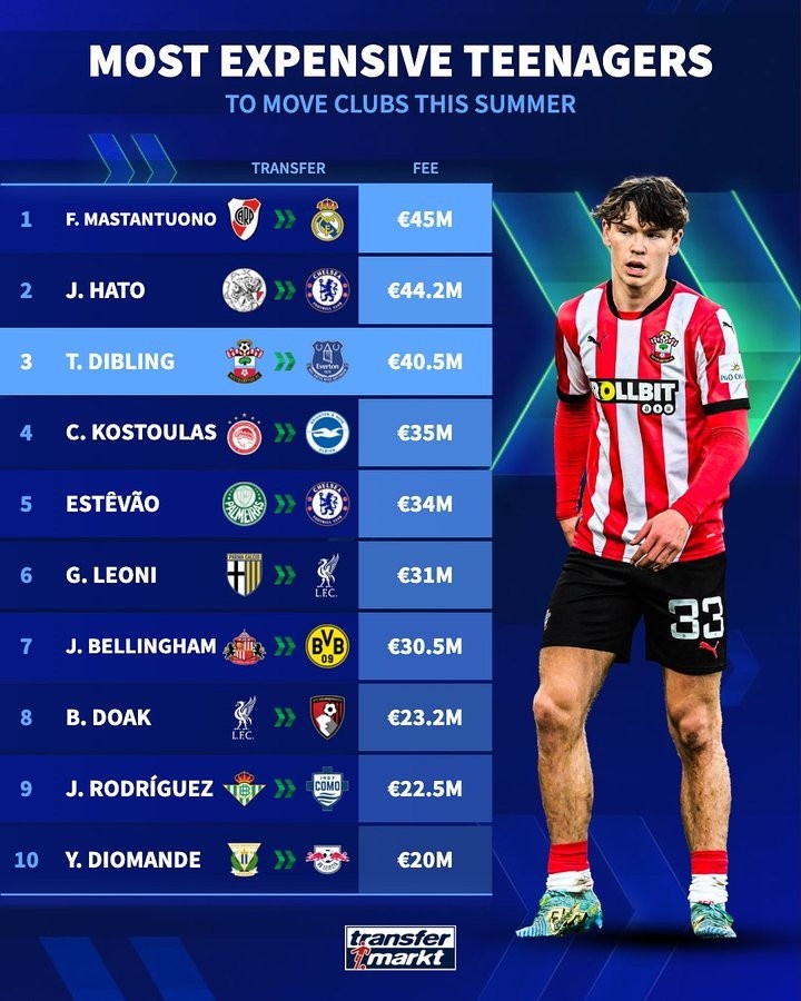 今夏U19球员转会费排行:马斯坦托诺4500万欧居首
