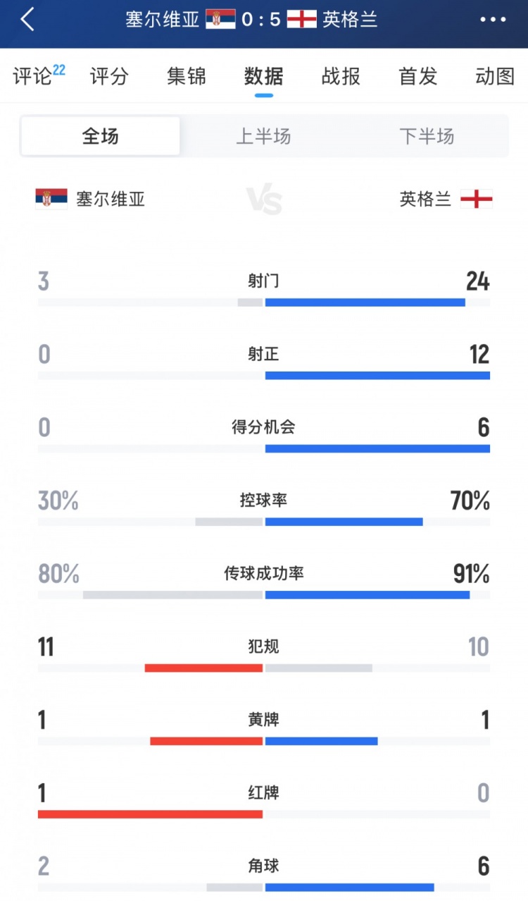 反客为主,英格兰vs塞尔维亚全场数据:射门24-3,控球率70%-30%