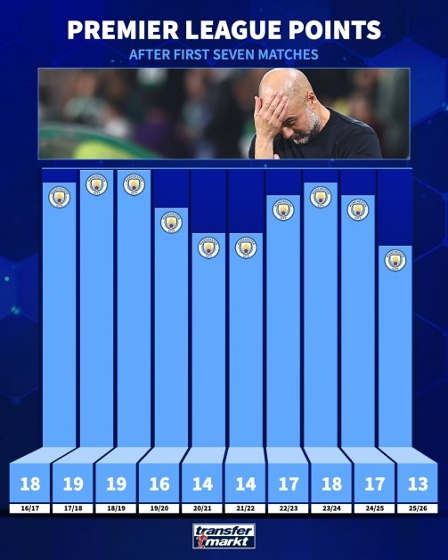 10月6日讯 英超第7轮比赛,曼城客场1-0降服布伦特福德。德国转会市集统计了瓜迪奥拉持教曼城赛季前7轮比赛的积分,本赛季13分革命低。