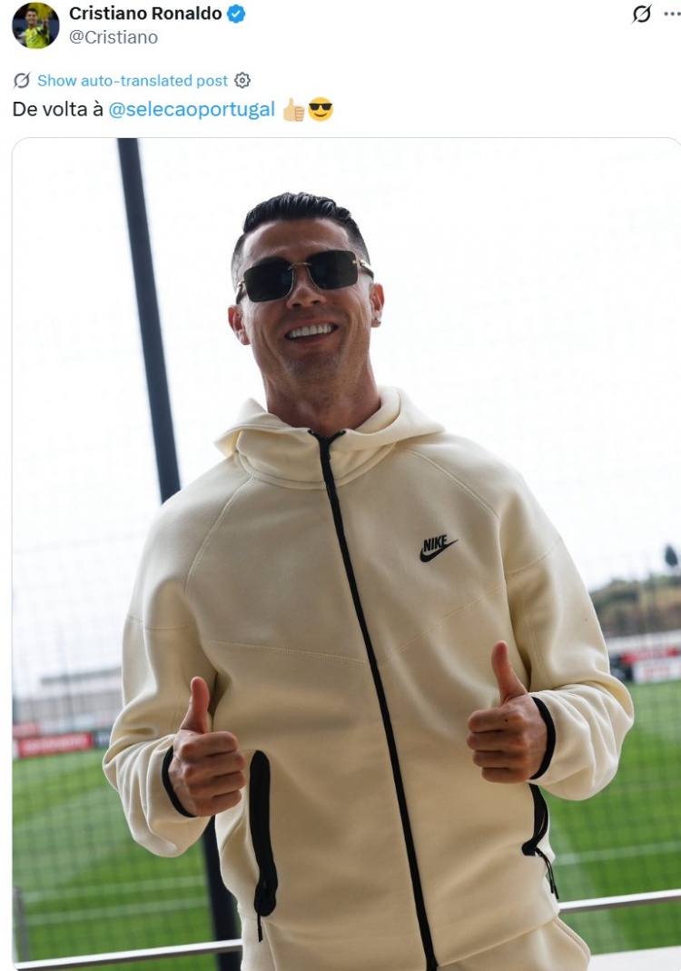 C罗社媒晒回到葡萄牙国度队报谈像片,戴墨镜出镜帅气透顶