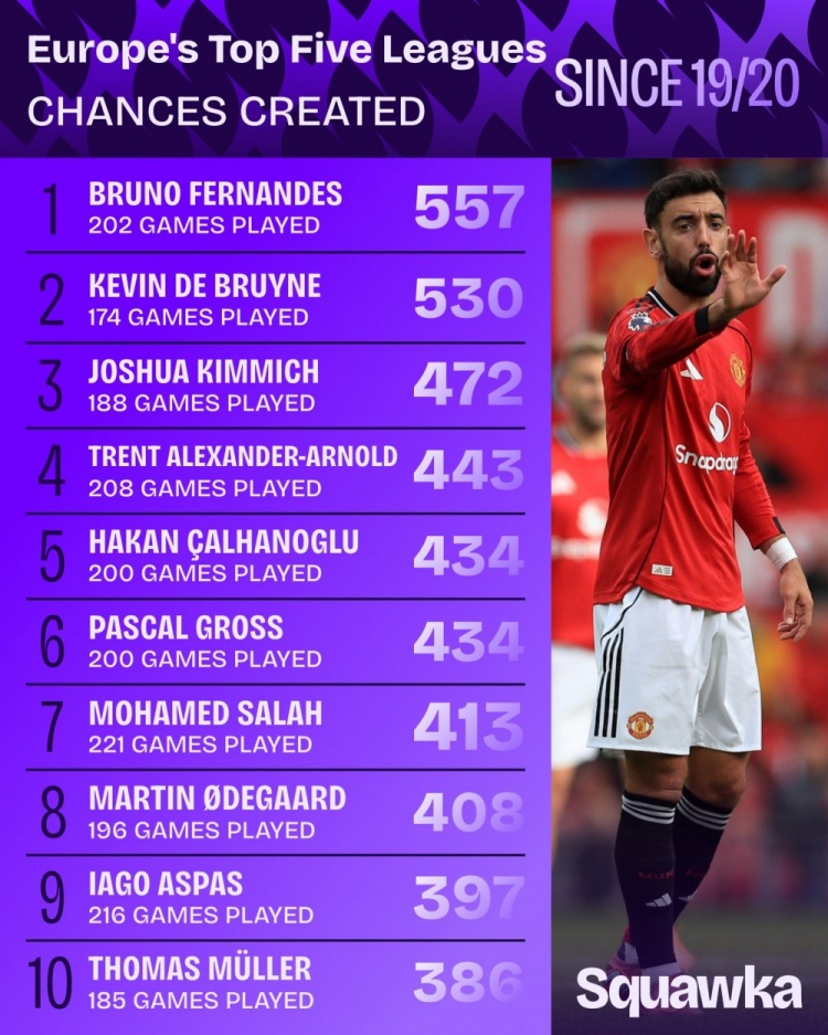 10月10日讯 据Squawka统计,2019-2020赛季以来,B费创造557次契机,五大联赛同时最多。