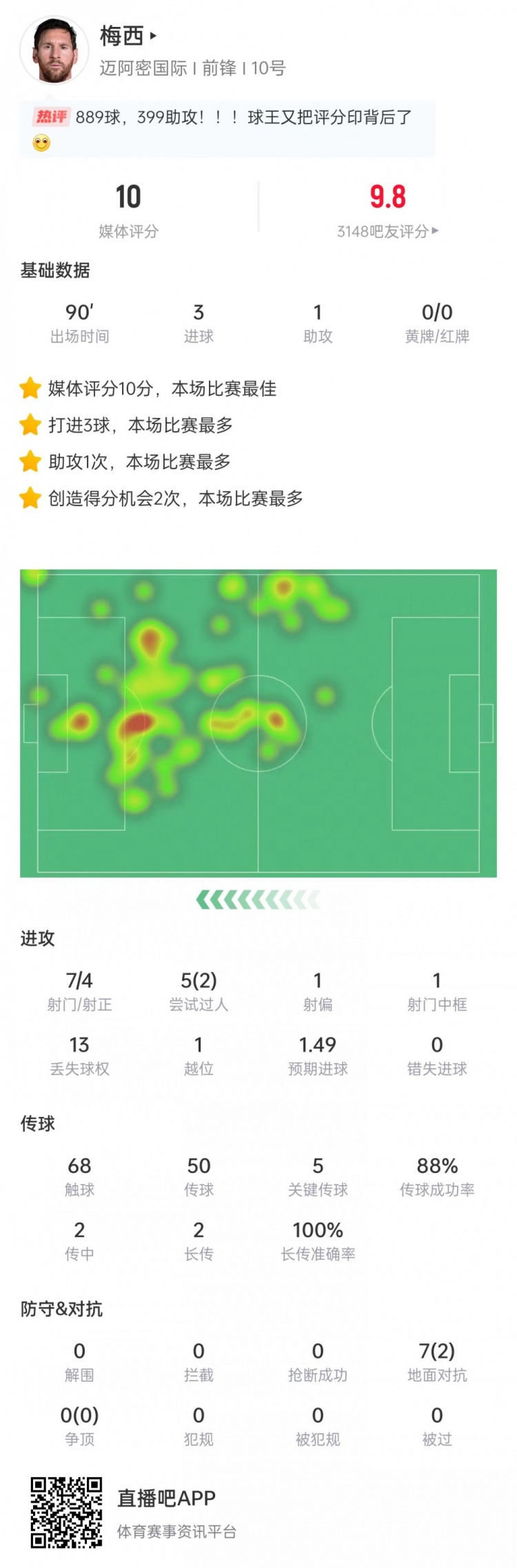 满分推崇!梅西本场数据:3射1传+5次要道传球,获评10分