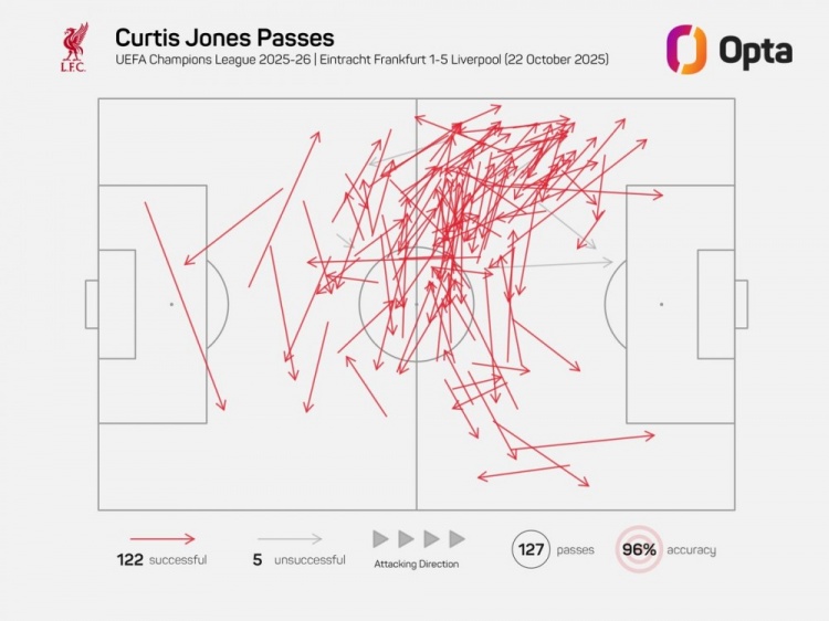 此役柯蒂斯-琼斯为利物浦踢满全场,到手传球122次,这是2003-2004赛季Opta统计有关数据以来,利物浦球员欧冠单场到手传球记载。