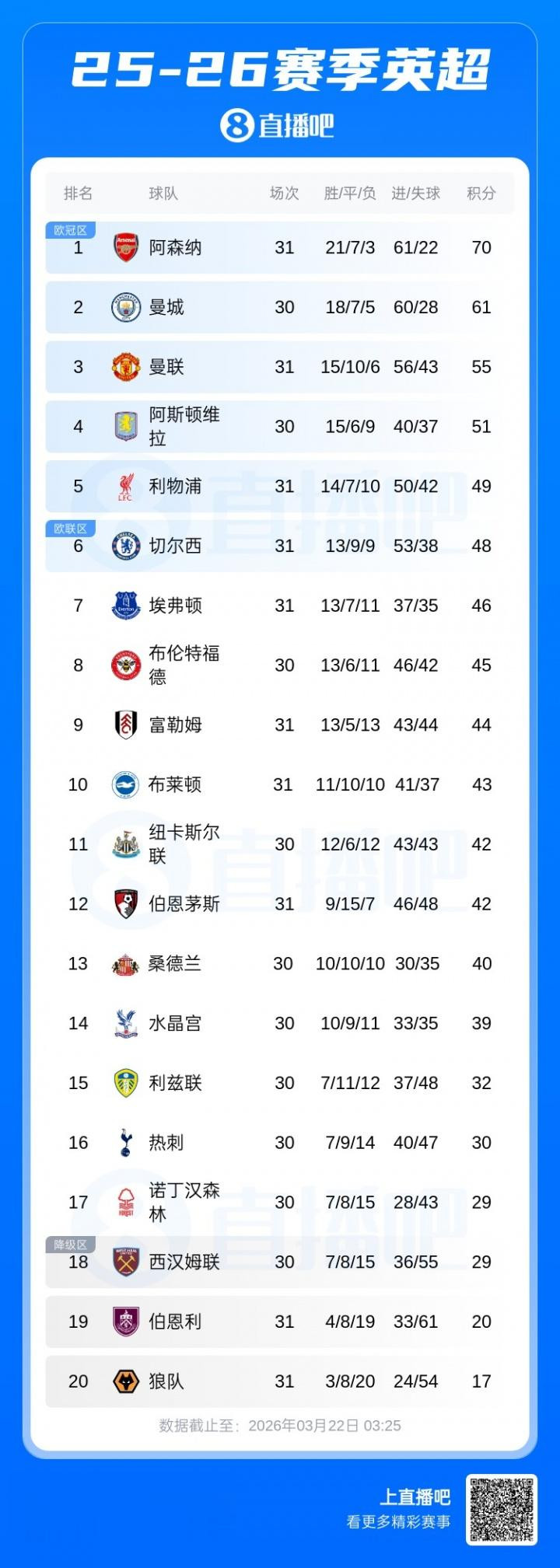 即将出战的布伦特福德若能战胜利兹联,积分将追平切尔西。此外,埃弗顿也凭借这场胜利暂时来到了第7的身位。
