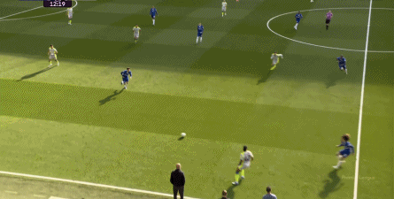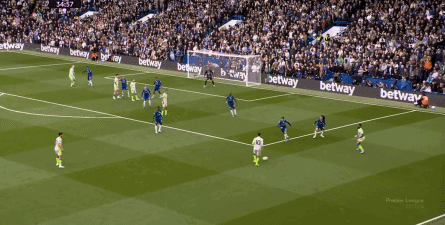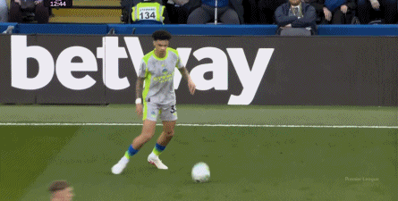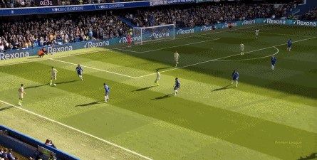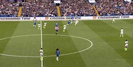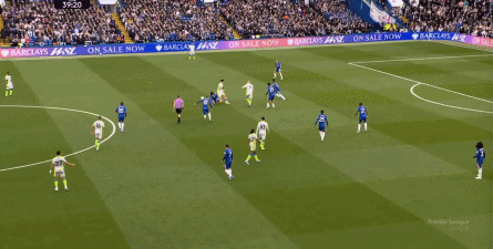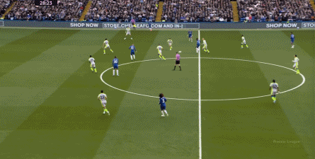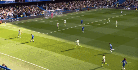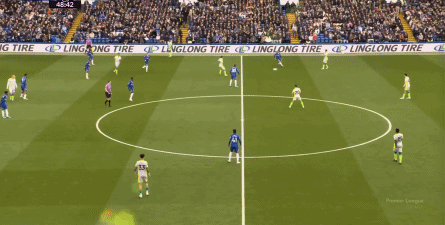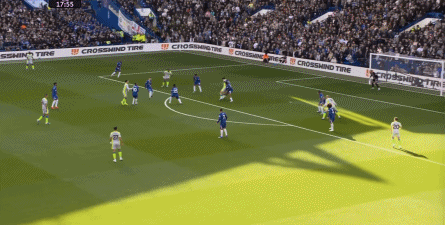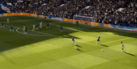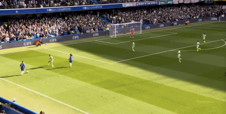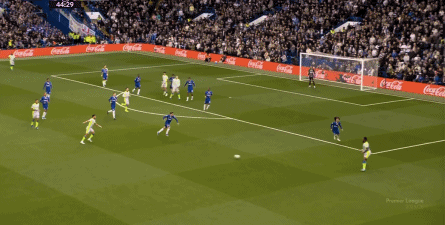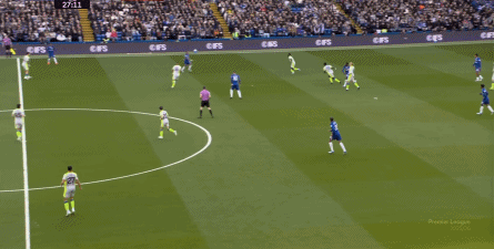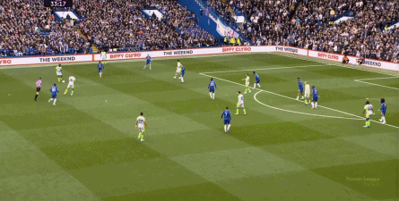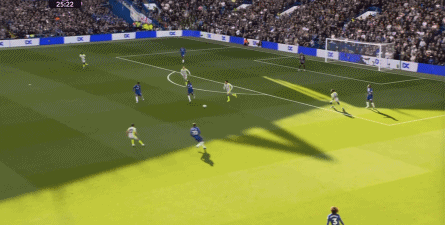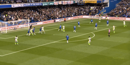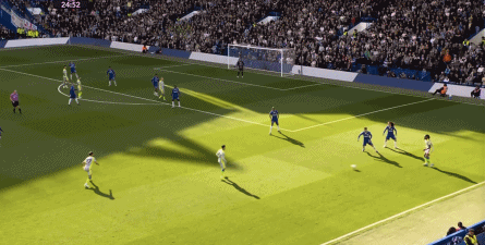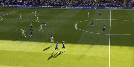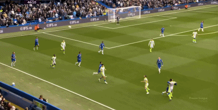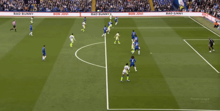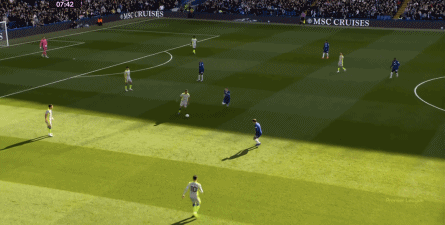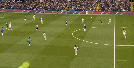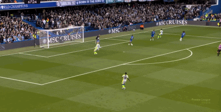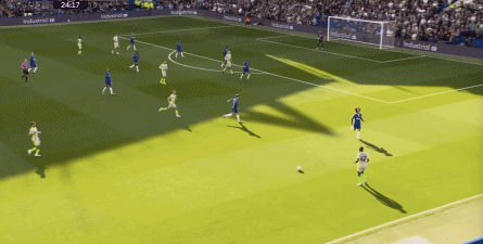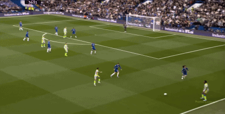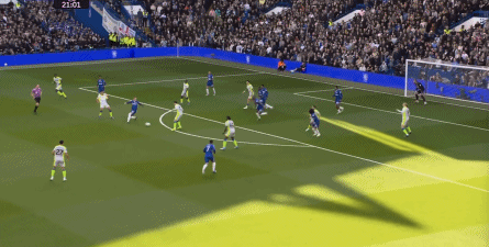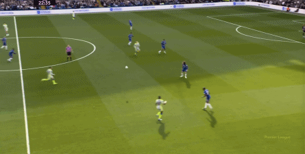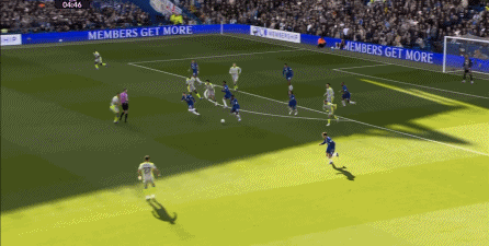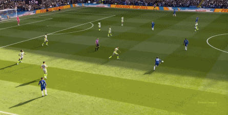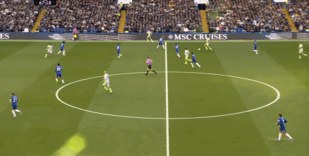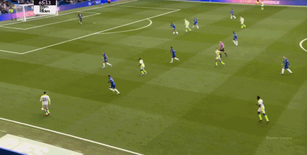这种情况下,帕尔默和若昂-佩德罗又不能直接从中路打出攻击 ,也就不能吸引防卫 重心,从而给边路制造出更大的空间,所以在上半场后半段,切尔西的威胁攻击 就变得很少了,这次帕尔默在中路实际错误 ,但错进错出形成的传中,就是为数不多的机会了: