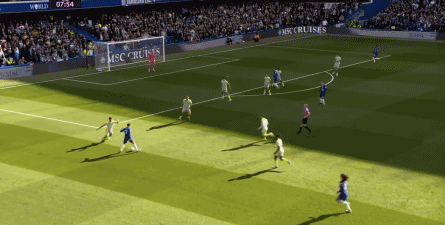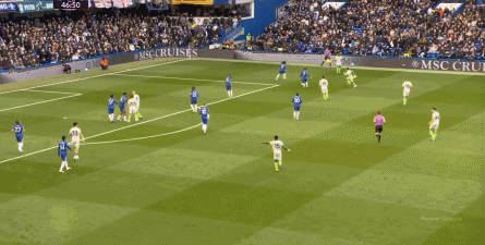 丢球了,切尔西在主场作战 总该有些变化了吧,你不能说没有,这体现在他们的前场逼抢力度稍有提高,但并没有提高到足以干扰曼城后场球员起脚质量的高度,所以曼城反而打出了两次不错的打身后,这就把切尔西又给打回去了: