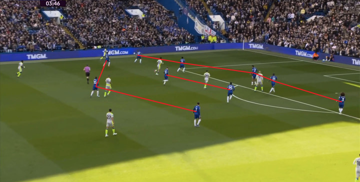 所以,怎么着可能都不行,但至少在今天,体现出来的问题就是帕尔默不能在中场球员中路防卫 ,尤其是在上半场末段,随着奥赖利带着身板的后插上开始上线,切尔西在这一侧承受的压力就更大了: