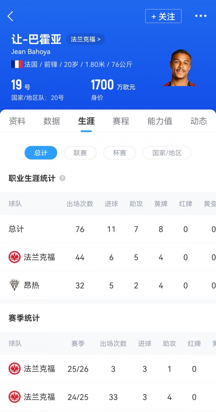 巴霍亚旧年冬窗800万欧元从昂热转会法兰克福,当今身价1700万欧元。图片报暗示,法兰克福里濒临巴霍亚的估值至少7000万欧元,以致达到8000万欧元。