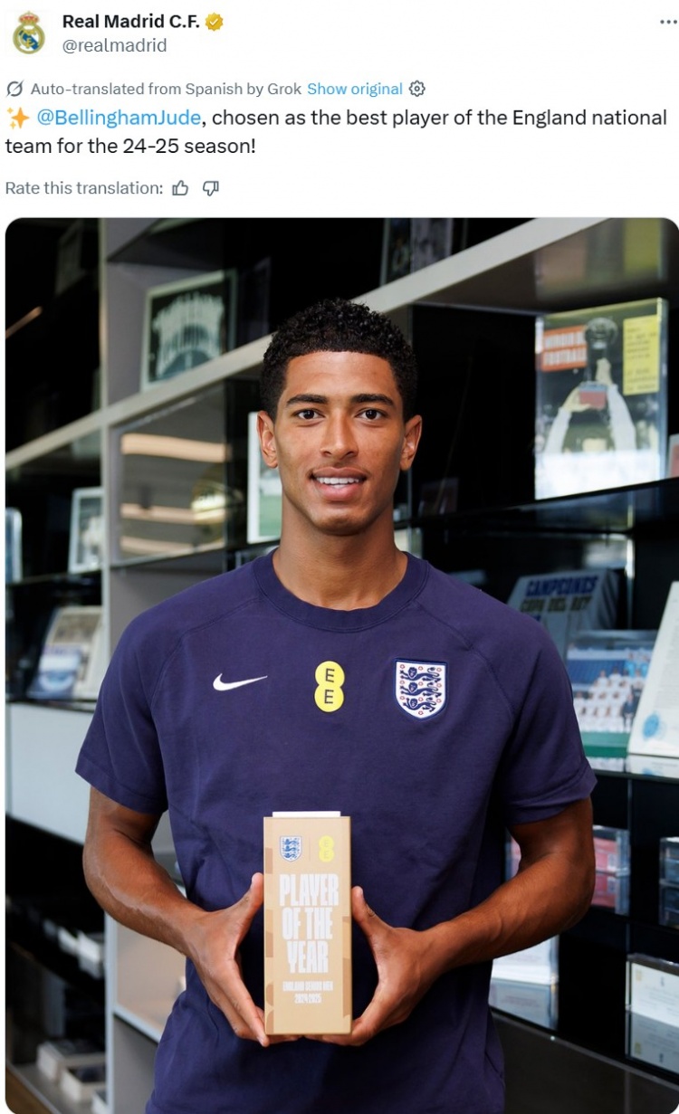 贝林厄姆当选英格兰24/25赛季最好男足球员,皇马官推奉上祝颂