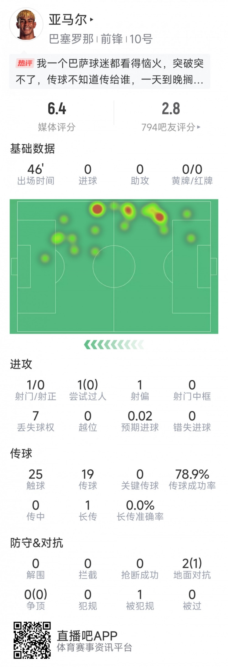 亚马尔半场数据:1次射门0射正,过东说念主、关节传球挂零,评分6.4分