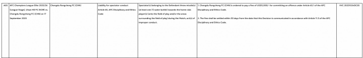 1-成皆蓉城俱乐部因违犯亚足联《顺次与说念德准则》第65.1条,被责令支付3000好意思元罚金。