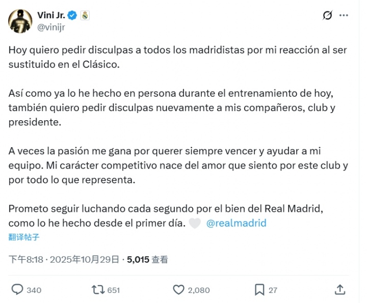 10月29日讯 皇马边锋维尼修斯在社媒发布了一则说念歉声明,因在国度德比中被换下时的争议活动向球迷、队友、球队和俱乐部主席说念歉,而致歉中并未提到主帅阿隆索。