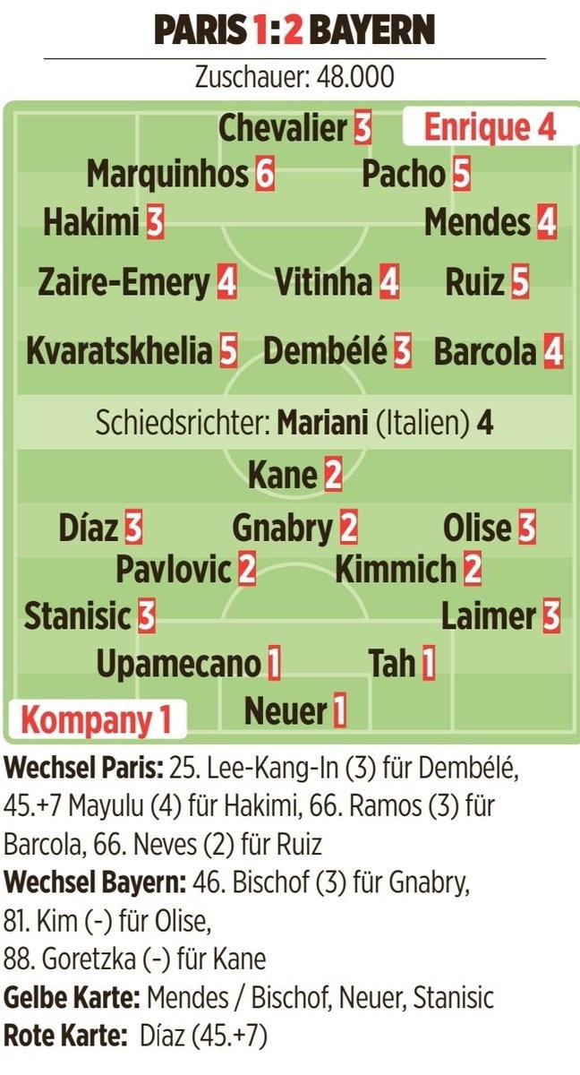 11月5日讯 巴黎在本轮欧冠焦点战主场1-2不敌拜仁,马尔基尼奥斯直立、迪亚斯双响后染红,《图片报》在赛后为两队进行了评分:(1分最好、5分最差,6分畸形于负分)