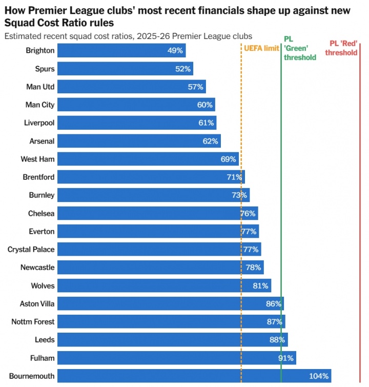 布莱顿以49%的比例理解最好,财务景色最为健康,热刺和曼联紧随后来。但是,不少俱乐部靠近合规压力,维拉、诺丁汉丛林等队已跳动欧足联设定的已毕线,而伯恩茅斯更所以104%的比例高居榜首,致使冲破了英超联赛设定的“绿色”安全阈值,泄透露较高的财政风险。