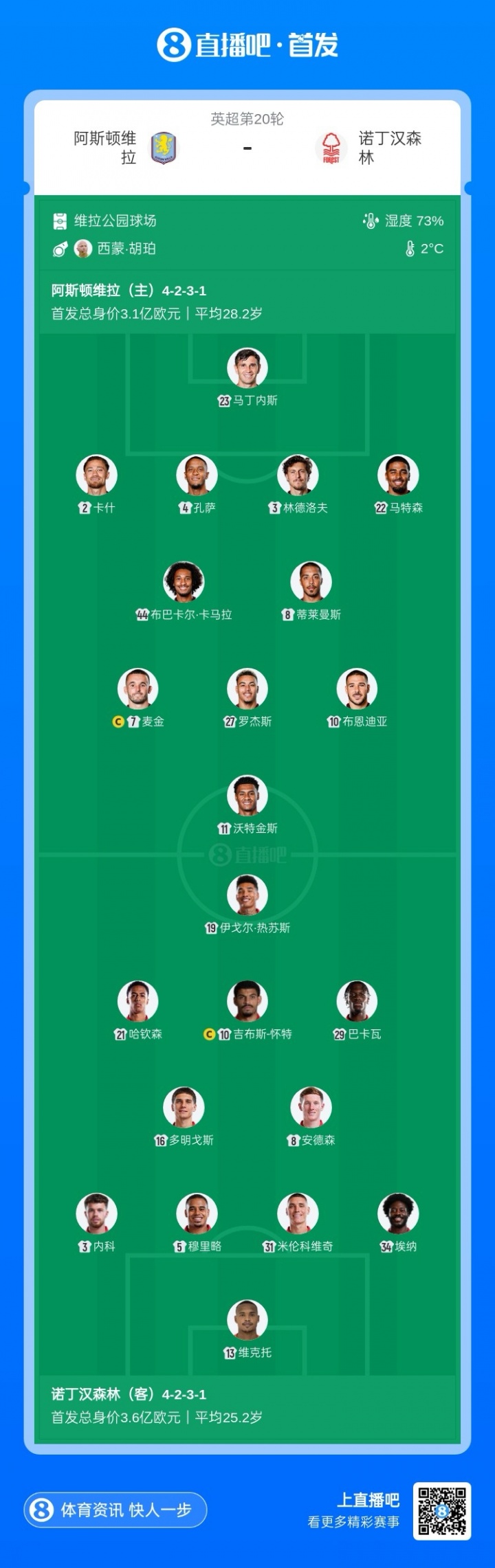 诺丁汉丛林首发:13-约翰·维克托、5-穆里略、31-米伦科维奇、34-埃纳、3-内科-威廉姆斯、21-哈钦森、8-埃利奥特·安德森、10-吉布斯·怀特、16-多明戈斯、19-伊戈尔·热苏斯、29-巴卡瓦