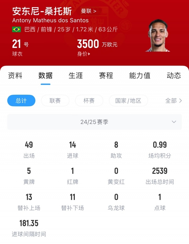 25岁的安东尼2022年8月加盟曼联,总价9500万欧。遵循曼联于今,他各项赛事代表球队出战96场收货12球5助。